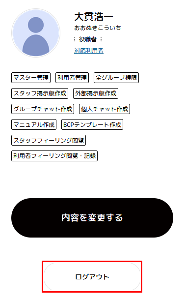 2023年10月23日 2023年10月23日 管理者 全般 アプリからログアウトする アプリからログアウトするには、画面右上のユーザーアイコンをタップしてユーザー情報ページを開きます。 [ログアウト]をタップします。