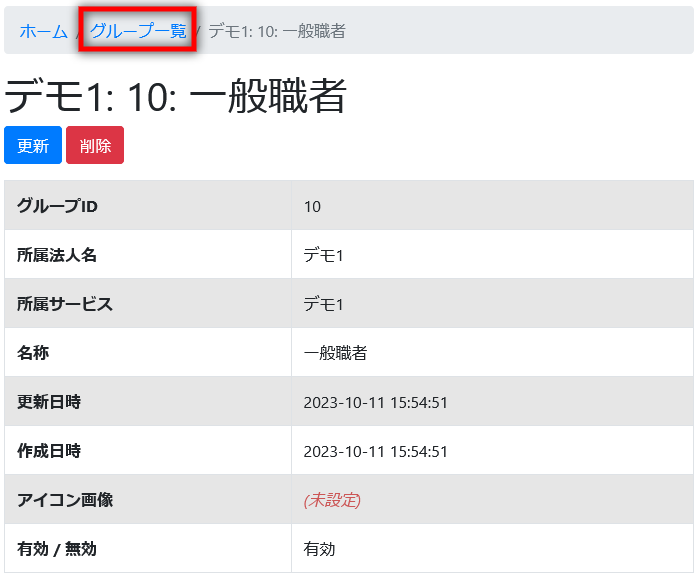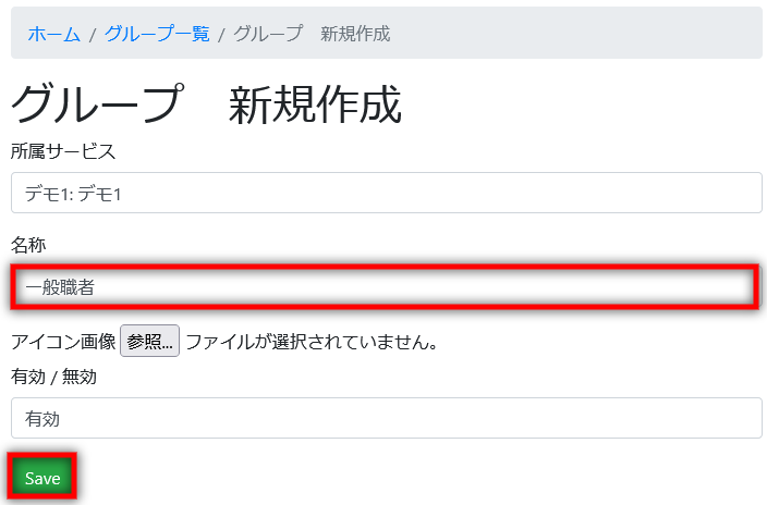 2023年10月11日 2023年10月11日 管理者 グループ管理 グループを新規作成する [新規作成]ボタンをクリックします。 [名称]を入力し[Save]をクリックします。 作成に成功すると下図のような画面が表示されます。[グループ一覧]をクリックすると元の画面に戻ることができます。